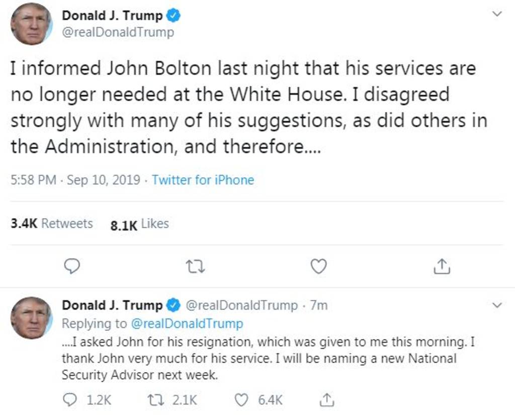 وتأتي تغريدات ترامب قبل نحو 90 دقيقة من توقع ظهور بولتون في مؤتمر صحفي مع وزير الخارجية مايك بومبيو ووزير الخزانة ستيفين منوشين.