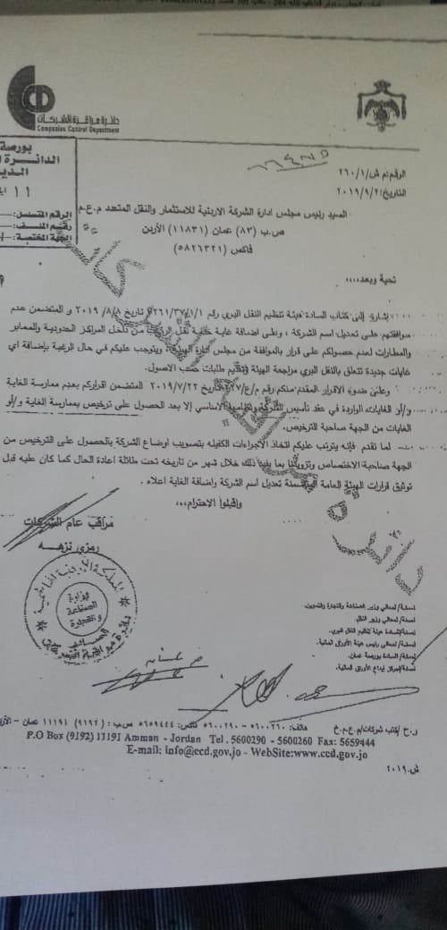 اشارة الى كتاب السادة هيئة تنظيم النقل البري رقم 1261/37/1/1 تاريخ 8/8/2019 والمتضمن عدم موافقتهم على تعديل اسم الشركة وعلى اضافة غاية خدمة نقل الركاب من داخل المراكز الحدودية والمعابر والمطارات لعدم حصولكم على قرار بالموافقة من مجلس ادارة الهيئة ويتوجب عليكم في حال الرغبة باضافة اي غايات جديدة تتعلق بالنقل البري مراجعة الهيئة وتقديم طلبات حسب الاصول .