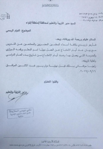 اخبار البلد -طلب وزیر التربیة والتعلیم ولید المعاني أسماء المعلمین المضربین والممتنعین عن التدریس حسب كتاب صدر الیوم.