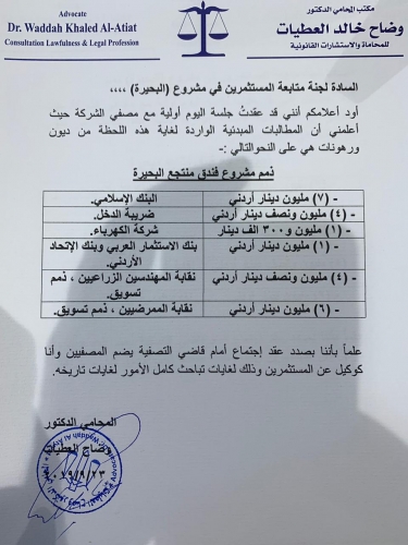 وبينت الوثيقة وجود ذمم وديون باهضة جداً على مشروع فندق منتجع البحيرة تمثلت كالتالي البنك الاسلامي( 7) مليون ، ضريبة الدخل (4.5 ) مليون ، شركة الكهرباء ( 1.300) مليون ، نقابة المهندسين الزراعيين (ذمم تسويق 4.5 مليون ) ، نقابة الممرضين (ذمم تسويق 6 مليون)