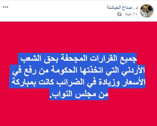 وقال الحباشنة في منشور له عبر فيسبوك : "ان جميع القرارات المجحفة بحق الشعب الأردني التي اتخذتها الحكومة من رفع في الأسعار وزيادة في الضرائب كانت بمباركة من مجلس النواب".