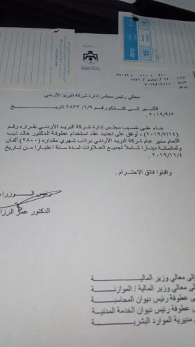 ومن الملاحظ في هذا الكتاب الموجه الى رئيس مجلس ادارة شركة البريد الاردني ان كتاب رئيس الوزراء طالب بمعرفة سبب منح المدير العام مبلغ( 15000) كمكافئة عن عام 2016 ، ومبلغ( 20000) دينار عن عام 2017، واشار الكتاب على ان الاسباب الموجبة لمنحه هذه المكافئة الواردة في كتاب مجلس الادارة هي من صلب مهام المدير العام . (ونحن نسأل هل أعاد مدير عام البريد هذه المبالغ)