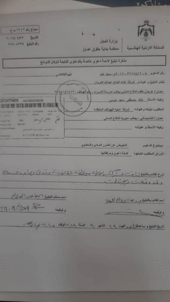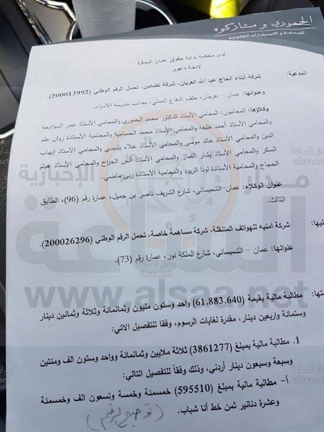 تقدمت شركة ابناء الحاج عبدالله العريان بدعوى لدى محكمة بداية حقوق عمان للمطالبة بمبلغ 61.8 مليون دينار من شركة امنية للهواتف المتنقلة.