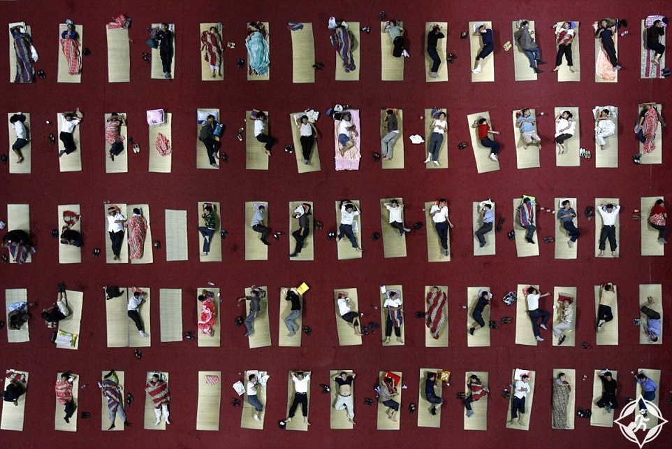 في جامعة ووهان بمقاطعة هوبى، حيث ينام الطلاب على الحصير الذي وضع على أرضية الصالة الرياضية المكيفة هربا من الحرارة.