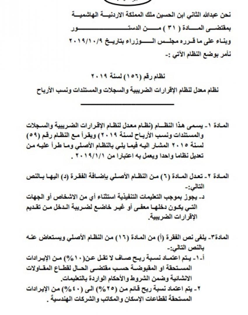 صدر في عدد الجريدة الرسمية اليوم الخميس، الارادة الملكية السامية بوضع النظام المعدل لنظام الإقرارات الضريبية والسجلات والمستندات ونسب الارباح. ويدخل النظام حيز التنفيذ بعد 24 ساعة من نشره في الجريدة الرسمية.