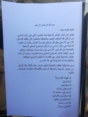 اعتصم أبناء من عشائر الدعجة أمام جامعة العلوم الإسلامية للمطالبة بفرص عمل داخل الجامعة حسب النسبة القانونية، مؤكدين بأنه يتوفر الكفاءات المطلوبة لجميع الوظائف والتخصصات الموجودة في الجامعة.