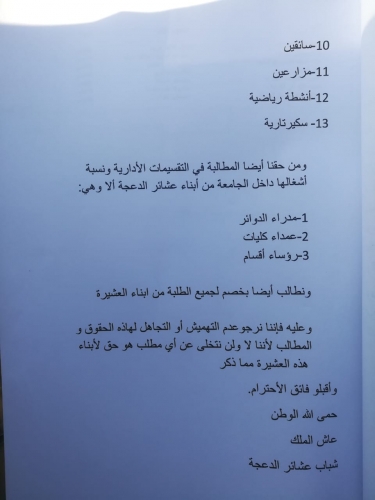 وطالب المعتصمين بتوفير فرص عمل لأبناء عشائر الدعجة والمرفقة أسمائهم بالكشوفات المقدمة بالوظائف.