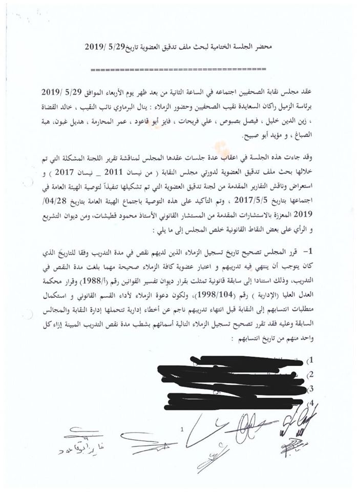 #أولاً: القرارات الصادرة عن المحكمة الإدارية بإلغاء قرار فصل بعض الزملاء من عضوية نقابة الصحفيين، كانت متوقعة بالنسبة لي، وهو ما حذرت منه المجلس في حينه، و دفعني لتسجيل تحفظي على قرارات الفصل تلك حسبما هو مبين في صورة محضر جلسة المجلس المرفقة، مع ضرورة الإشارة إلى أن القرارات خرجت بهذه الصورة بعد جهد جهيد حيث كان بعض الزملاء يدفع نحو فصل أضعاف الرقم الذي انتهى إليه المحضر المنشور مع هذا البيان، وقد استنفذ هذا الملف وقتا طويلا من مداولات المجلس وتسبب في شروخ عميقة داخل المجلس، وشهد تحفظات مختلفة بعضها مسجل وبعضها برز في المداولات فقط، وأشير هنا إلى أن الموقف المعلن من قبلي ومنذ اليوم الأول لبحث هذا الملف هو ذات الموقف الذي بقيت عليه حتى طي الملف والانتهاء منه ويمكن لأي منكم العودة إلى البيان المنشور على صفحتي على "الفيسبوك" بتاريخ 20/12/2018 (https://bit.ly/33mGlyM ) و المنشور الثاني بتاريخ 22/1/2019 (https://bit.ly/2OOB2mv)، والتي تدحض بعض الروايات و الأقاويل التي استهدفتني بشكل شخصي لتصفية حسابات، والتي للأسف كانت مضلله و تعاكس الواقع، فالزميل الذي يدعي أمام البعض أنني كنت ممن دفعوا إلى فتح الملف عندما كان هو يرغب بطيه وماطل لهذه الغاية طويلا قبل طرحه على طاولة المجلس كان في الحقيقة عند فتح الملف يطلب فصل كل زميل تضمنت محاضر لجنة التدقيق ملاحظات على عضويته وسجل تحفظاته على التجاوز عن بعض الملاحظات قبل أن يعود إلى سحب تحفظاته في المحضر الأخير لهذا الملف.