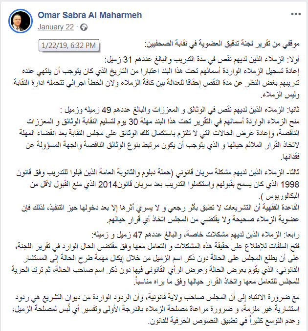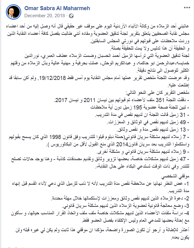 نشر عضو مجلس نقابة الصحفيين الأردنيين، الزميل عمر صبرة المحارمة، بيانا صحفيا، تحدث به عن العديد من الملاحظات حول عدة ملفات وقضايا جدلية واجهت مجلس النقابة الحالي وموقفه منها، وخاصة فيما يتعلق بقرار المجلس فصل (23) عضو هيئة عامة ، وقيام القضاء بإعادة (3) منهم حتى اللحظة.