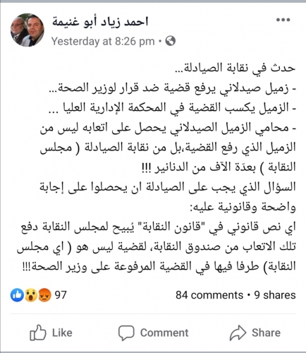 نشر النقابي أحمد أبو غنيمة عبر صفحته على مواقع التواصل الاجتماعي "الفيسبوك" عن قيام مجلس نقابة الصيادلة بدفع مبلغ مالي أتعاب محامي لزميل صيدلاني، في القضية التي قام برفعها الصيدلاني ضد قرار لوزير الصحة ، وكسبها في المحكمة الإدارية العليا.