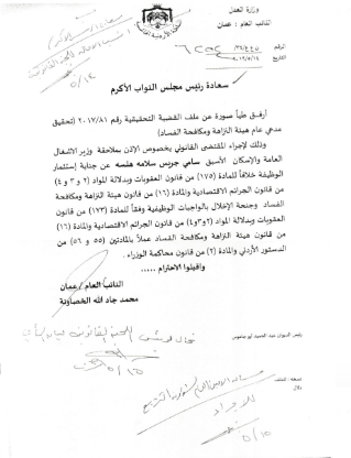 أكد المكتب الدائم في مجلس النواب إحالة رئيس مجلس النواب المهندس عاطف الطراونة لطلبين من النائب العام بملاحقة وزيرين سابقين، كان النائب العام أرسل بهما إلى مجلس النواب بتاريخ الرابع عشر من أيار الماضي، وفي تلك الفترة كان المجلس قد أنهى دورته العادية الثالثة ولم يكن المجلس في فترة انعقاد.