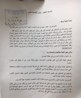 ووجه العاملون في الجامعة كتاب "استدعاء" الى الرئيس طالبوه فيه بعقد اجتماع عام وباسرع وقت ممكن مع اعضاء الهيئة الادارية في الجامعة لعرض جميع مطالبهم .