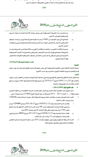 وأوصى التقرير بمتابعة المشكلة لحصر القضايا الجمركية التي مضى عليها فترة زمنية طويلة ولك يتم البت بها من قسم القضايا بمديرية مكافحة التهريب، مشيرا بأنه تم تشكيل لجنة للتدقيق والتحقيق في الموضوع ولم تنهي أعمالها لغاية تاريخه بالرغم من تأكيد رئيس الوزراء بكتاب بتاريخ 17/4/2019 على ضرورة رفع اللجنة توصياتها خلال أسبوع من تاريخ الكتاب وما زال الموضوع قيد المتابعة.