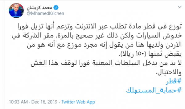شدد الصحفي التونسي محمد كريشان، الذي يعد أحد أبرز وجوه قناة الجزيرة القطرية، على السلطات في الدوحة مطالبته بضرورة حماية المستهلك بسبب مادة توزع في قطر وتطلب عبر الانترنت وتزعم أنها تزيل خدوش السيارات فورا.
