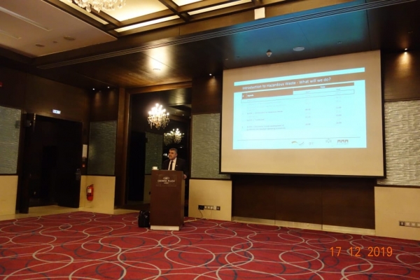 مندوباً عن امين عام وزارة البيئة افتتح مساعد الأمين العام للشؤون الفنية الدكتور محمد الخشاشنة يوم الثلاثاء الموافق 17/12/2019 ورشة عمل تدريبية في معالجة النفايات الخطرة وإدارتها في فندق كراون بلازا التي استمرت لمدة يومين بحضور الشركات الناقلة والشركات المعالجة والشركات المولدة للنفايات الخطرة والجهات الحكومية المعنية .