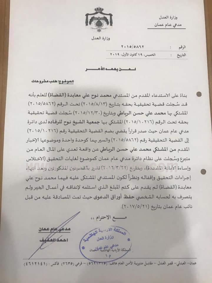 ووفق وثيقة قضائية بينت انه تم تسجيل قضيتي التعدي على المال العام من متبرع وقضية اساءة الامانة المشددة لدى دائرة مدعي عام عمان حيث تقرر (حفظ الدعوى) بالقضيتين بعد انتهاء اجراءات التحقيق ، والتي تبين من خلالها أن القضاة لم يقدم على كتم المبلغ الذي استلمه لانفاقه في اعمال الخير ولم يتصرف به لحسابه الشخصي ، وتمت المصادقة عليه من قبل نائب عام عمان بتاريخ 21/5/2017 .