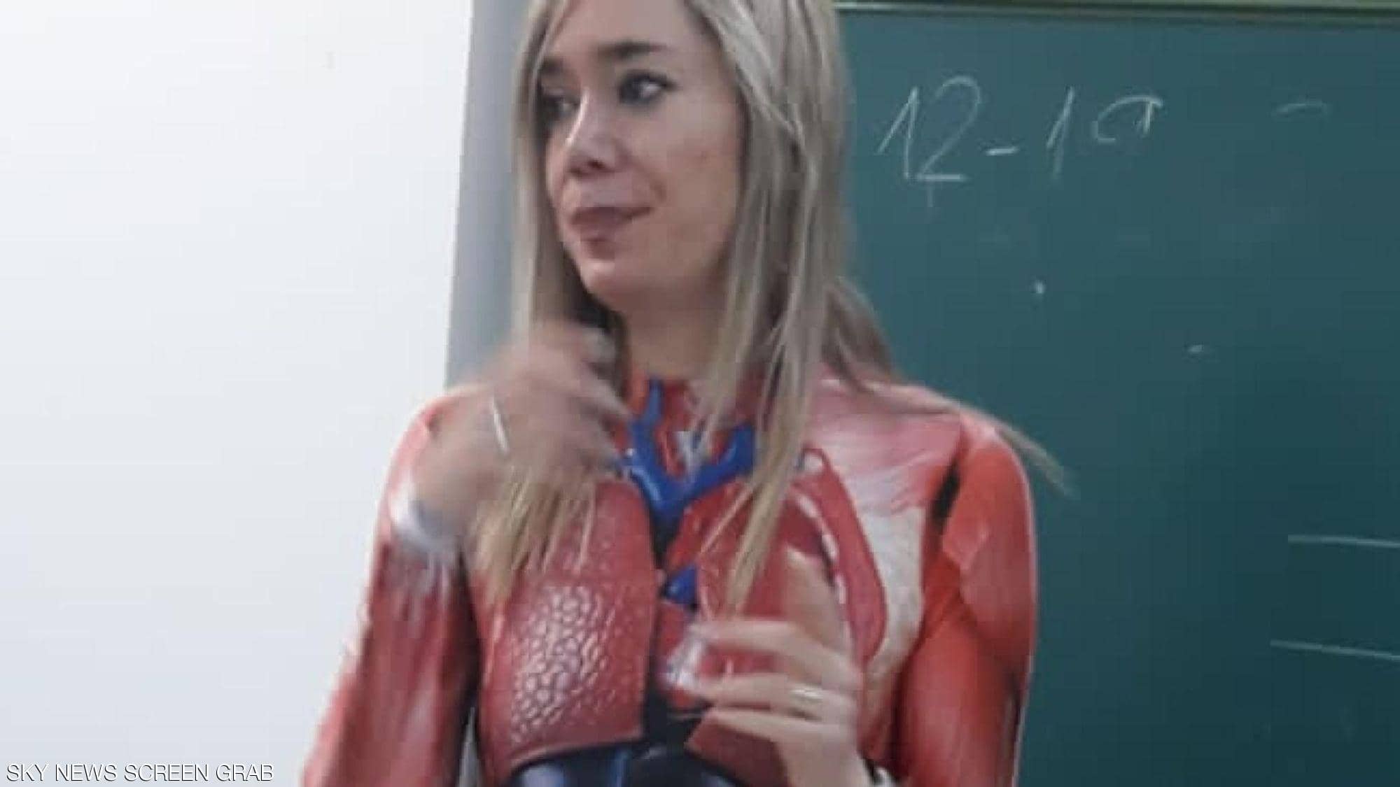 وارتدت المعلمة فيرونيكا دوكي بدلة تحمل صورا مفصلة لأعضاء الجسد الداخلية، مما سهل على طلاب الصف الرابع في مدرسة بمدينة بلد الوليد الإسبانية، استيعاب حصة الأحياء.