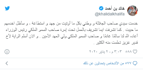 وقال في التغريدة: "خدمت سيدي صاحب الجلالة ووطني بكل ما أوتيت من جهد واستطاعة، وسأظل أخدمهم ما حييت".