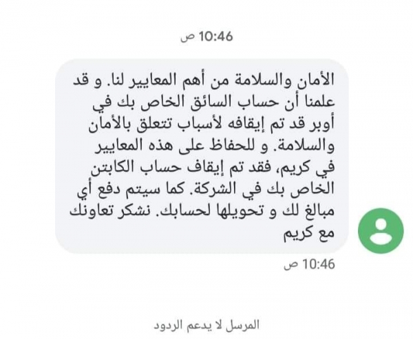وفي آخر صرعات تلك التطبيقات نشر رواد مواقع التواصل الاجتماعي والعاملين على هذه التطبيقات عبر "الفيسبوك" بقيام شركة "كريم" بإرسال رسالة للعديد من السائقين مفادها بأنه أثناء قيام مراجعة حسابات العملاء والكباتن على تطبيق "اوبر" قد تم إيقافه لأسباب تتعلق بالأمان والسلامة، وبالتالي وللحفاظ على هذه المعايير في شركة "كريم" فقد تم ايقاف حساب الكابتن الخاص بالشخص في الشركة.