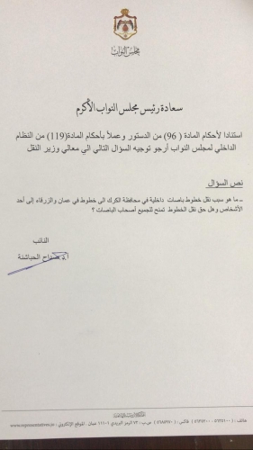 أخبار البلد - اخبار البلد - وجه النائب الدكتور صداح الحباشنة سؤال نيابي الى وزير النقل خالد سيف استفسر من خلاله غن اسباب نقل خطوط باصات داخلية في محافظة الكرك الى خطوط في عمان والزرقاء الى احد الاشخاص ؟ وهل حق نقل الخطوط تمنح لجميع اصحاب الباصات .