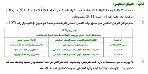 كشف تقرير ديوان المحاسبة للعام 2018 ، عن وجود عدد من الملاحظات على الهيكل التنظيمي في بنك تنمية المدن والقرى تمثلت بعدم استقلالية وحدة الرقابة الداخلية حيث يرتبط بالمدير العام خلافاً لاحكام المادة (5) من نظام الرقابة الداخلية رقم (3) لسنة 2011 وتعديلاته .