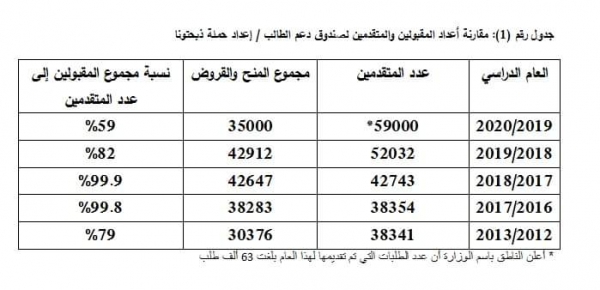 1- عدد المتقدمين لصندوق دعم الطالب بلغ هذا العام 59 ألف طلب ، ولم يتم قبول سوى 35 ألف طلب، فيما تقدم في العام الماضي 52 ألف طلب وتم قبول 42 ألف طلب ،وفي عام 2017/2018 تم قبول جميع الطلبة المتقدمين للصندوق، والحال نفسه ينطبق على العام الذي سبقه.