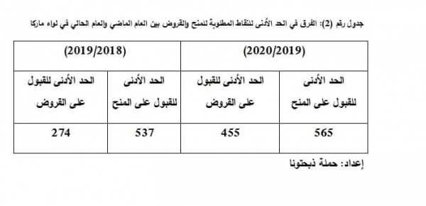 وعلى صعيد متصل، كشفت أرقام رسمية تحصلت عليها الحملة الارتفاع الكبير في الحد الأدنى من النقاط للحصول على قرض طلابي، فقد أظهرت نتائج لواء ماركا في محافظة العاصمة، أن الحد الأدنى للحصول على القرض ارتفع من 274 نقطة العام الماضي، ليصبح 455 نقطة، وبزيادة بلغت أكثر من 188 نقطة عن العام الماضي.