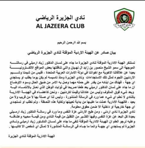 أخبار البلد - اخبار البلد - استنكرت الهيئة الادارية المؤقتة لنادي الجزيرة الرياضي ما جاء على لسان الدكتور زياد ارميلي في رسالته الموجهة الى سمو الشيخ منصور بن زايد آل نهيان .