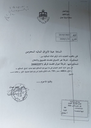 حصلت شركة عبر الاسواق لخدمات التسويق والاعلان على قرار قطعي من مأمور تنفيذ عمان يقضي بالحجز التنفيذي على اية اسهم تعود للمحكوم عليها في القضية التنفيذية ذات الرقم (13621/2019) شركة "اموال انفست" بقيمة (45) الف دينار تقريباً مطالباً الجهات ذات العلاقة لتنفيذ القرار حسب الاصول القانونية، وذلك تنفيذا لقرار الحكم .