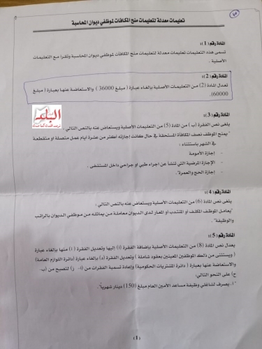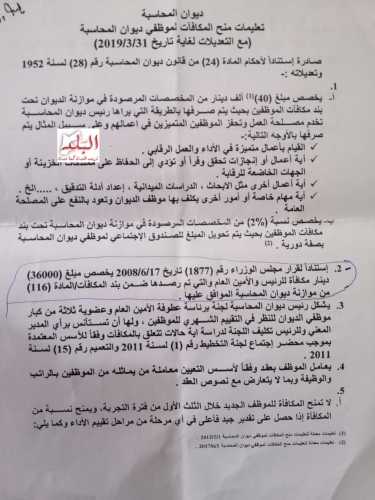 ومن تعليمات منح المكافآت لموظفي ديوان المحاسبة وتعديلاته وبالرجوع للمادة 2 من قرار مجلس الوزراء رقم 1877 تاريخ 17/6/2008 بأن يخصص مبلغ 36 ألف دينار مكافأة للرئيس والأمين العام لديوان المحاسبة والتي تم رصدها ضمن بند المكافآت/ المادة 116 من موازنة الديوان الموافق عليها.
