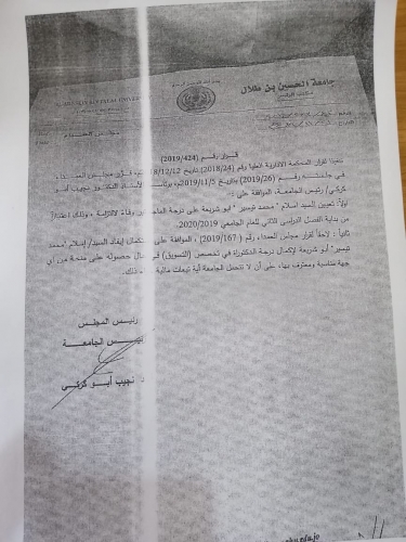 وأشار بأن مجلس العمداء أصدر قرار رقم (424/2019) في جلسته رقم (26/2019) المنعقدة بتاريخ 5/11/2019 وهذا القرر كان "بسحب وصفه" اشد ظلما وتعسفا ًمن القرارات السابقة ...حيث لم ينفذ قرار المحكمة الادارية العليا بحذافيره المتضمن تعيينه على درجة الماجستير وفاءا للالتزم منذ بداية الفصل الثاني 2019/2020 والموافقة على استكمال إيفاده لإكمال الدكتوراه في حال حصوله على المنحة وعدم تحمل الجامعة أي تبعات مالية.