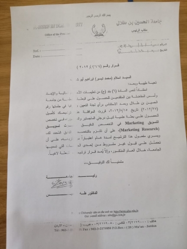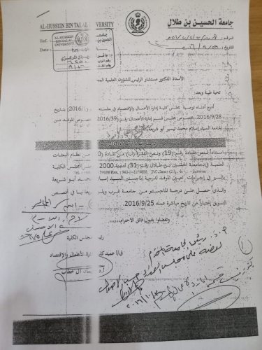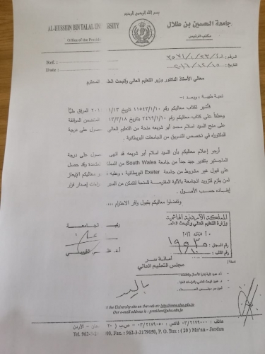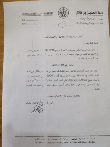 وتابع مضيفا : "ثم حصلت على قبول لدرجة الدكتوراه من جامعة اكستر/بريطانيا في تخصص التسويق وقدمته للجامعة بموجب استدعاء مرفق بكتاب عميد البحث العلمي والدراسات العليا رقم ع/4/1/561 تاريخ 15/12/2016. وتم مخاطبة التعليم العالي والبحث العلمي للاستفادة من المنح الجزئية التي حصلت عليها الجامعة من الحكومة البريطانية مع اعلامهم أني حاصل على قبول غير مشروط من جامعة (اكسترا ) البريطانية وشمولي بالمنح التي قدمت من الجامعات البريطانية للأردن وذلك بموجب كتاب معالي وزير التعليم العالي رقم 10/1/11543 تاريخ 13/11/2014، ثم لأسباب غير مبررة قانونا قد اصدر مجلس العمداء قراره رقم (82/2017) في جلسته المنعقدة بتاريخ 8/3/2017المتضمن إنهاء بعثتي دون سبب مشروع".