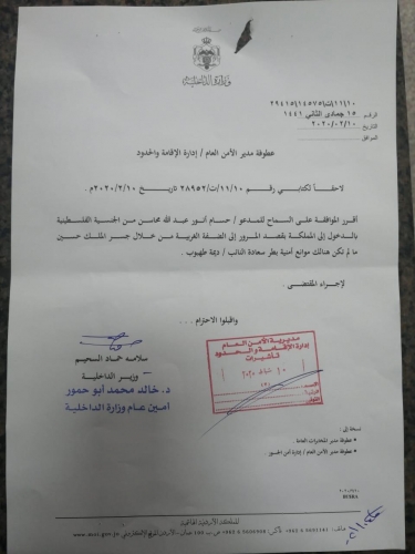 قرر وزير الداخلية سلامه حماد السماح للمدعو حسام انور عبدالله محاسن من الجنسية الفلسطينية بالدخول الى المملكة بقصد المرور الى الضفة الغربية من خلال جسر الملك حسين ما لم يكن هناك موانع امنية .