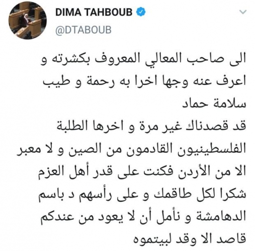 وكانت طهبوب وجهت رسالة عبر حسابها الخاص على "تويتر ” قالت فيها : ” إلى صاحب المعالي المعروف بكشرته و اعرف عنه وجها اخرا به رحمة و طيب سلامة حماد قد قصدناك غير مرة و آخرها الطلبة الفلسطينيون القادمون من الصين و لا معبر إلا من الأردن فكنت على قدر أهل العزم شكرا لكل طاقمك و على رأسهم د باسم الدهامشة و نأمل أن لا يعود من عندكم قاصد الا وقد لبيتموه .