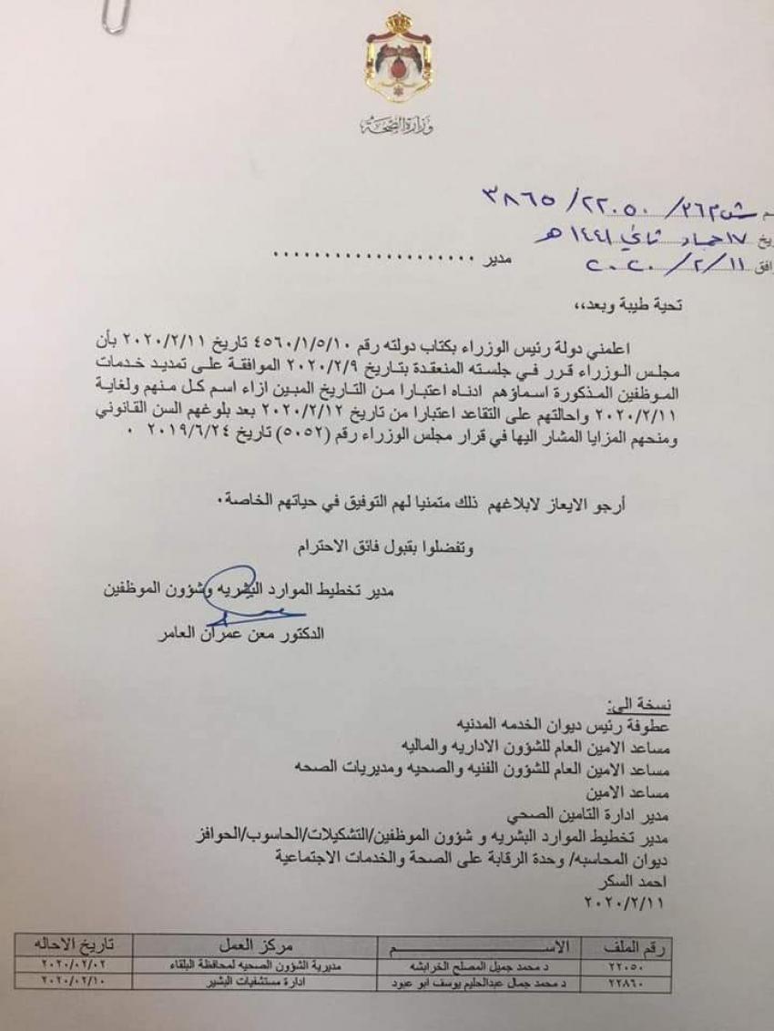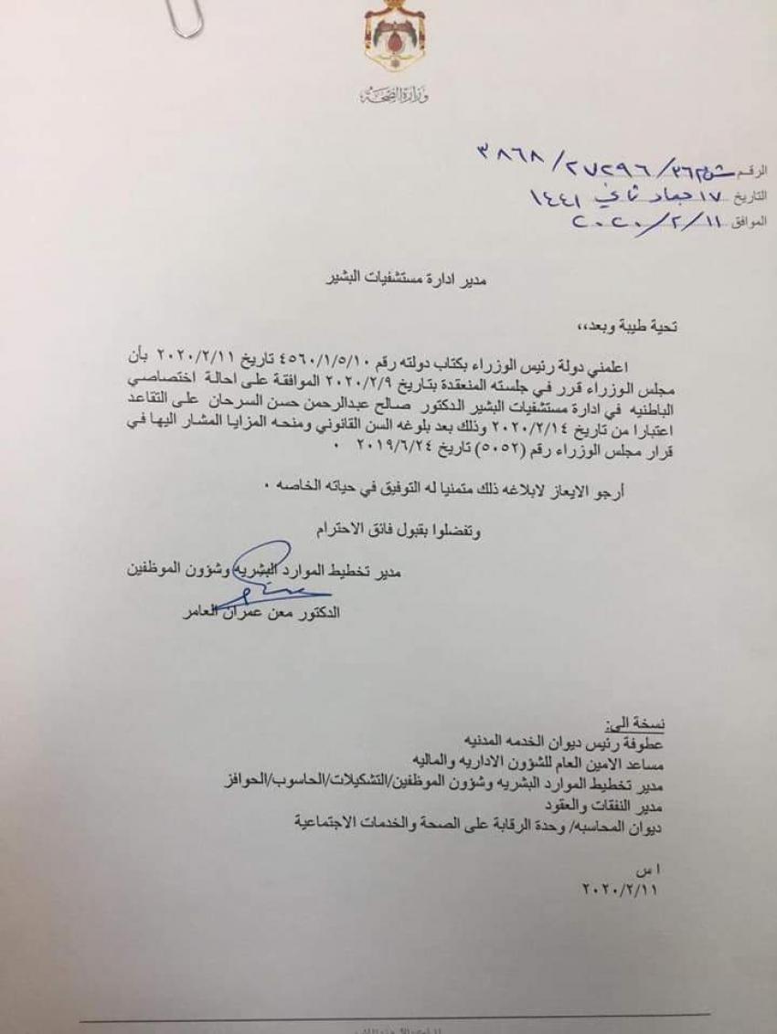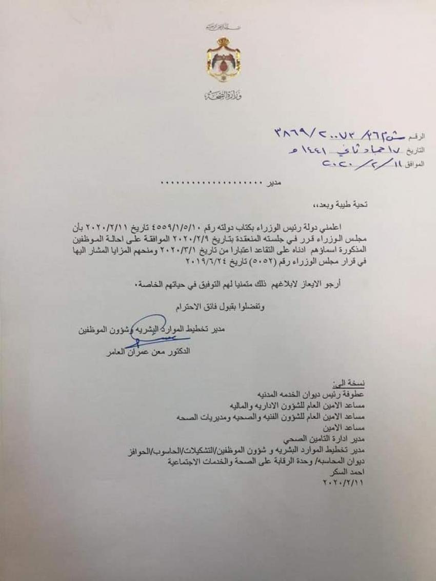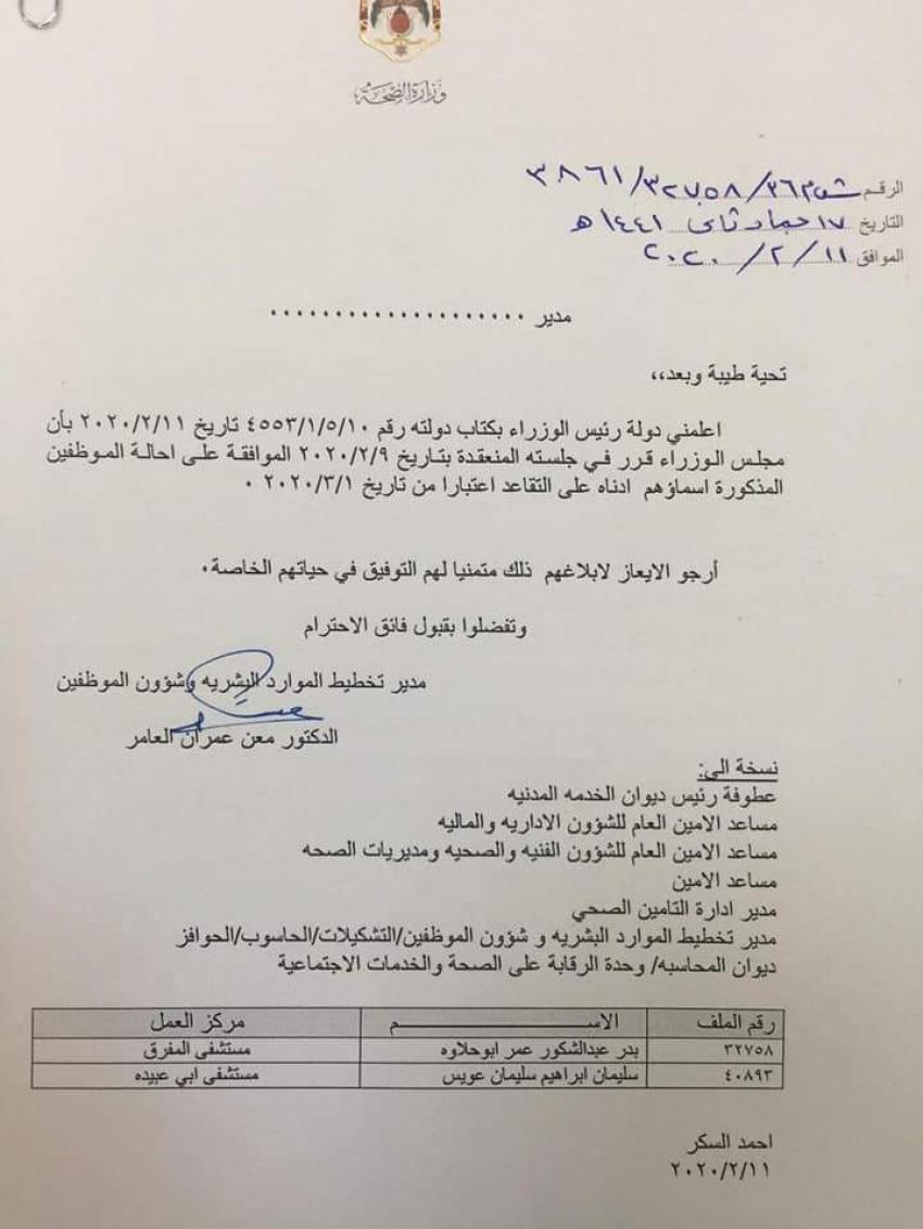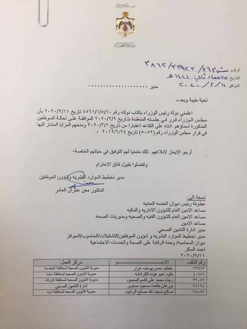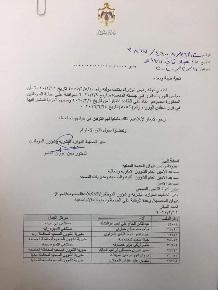 قرر مجلس الوزراء وبناء على تنسيب وزير الصحة إحالة عدد كبير من الموظفين الى التقاعد اعتبارا من تاريخ 1/3/2020.