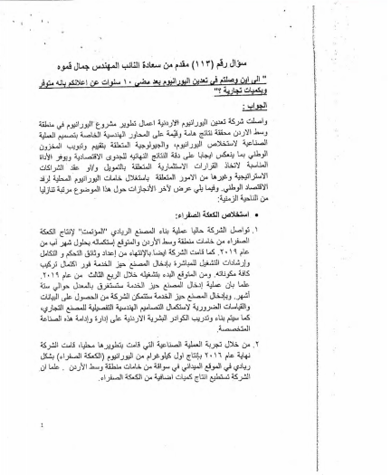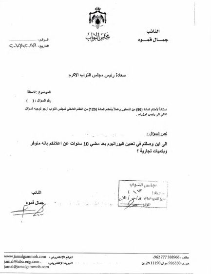 كشف النائب المهندس جمال قموه عن اسباب تحويل سؤاله النيابي الذي وجهه الى رئيس الوزراء الدكتور عمر الرزاز الى استجواب وحيث كان نص السؤال " الى اين وصلتم في تعدين اليورانيوم بعد مضي (10) سنوات عن اعلانكم بانه متوفر وبكميات تجارية"؟