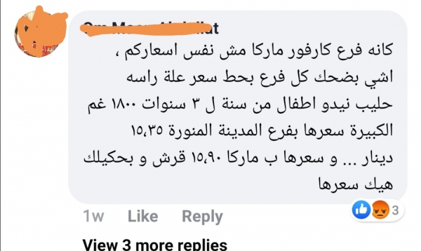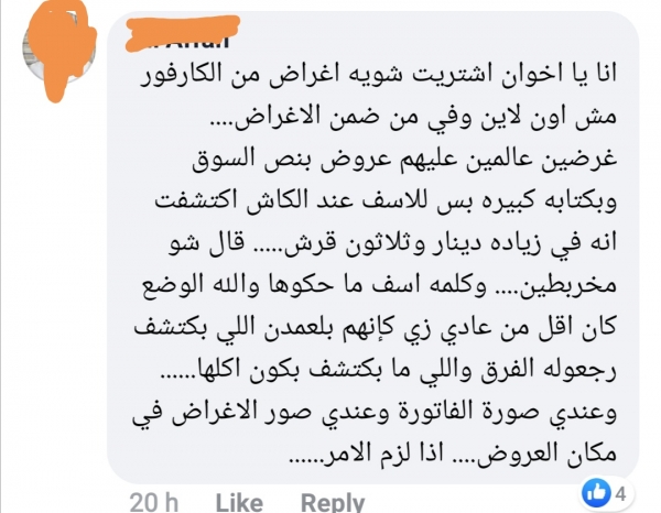 الشكاوى كثيرة ولا نعلم أسبابها أو التبريرات التي من الممكن أن تتحدث بها إدارة مول "كارفور" حول عدد من القضايا أهمها اختلاف الأسعار.. فقد انتشر على مواقع التواصل الاجتماعي شكاوى عديدة بحق "كارفور"وذلك بسبب اختلاف أسعار السلع المعروضة حيث يوضع عليها سعر منخفض ويفاجئ المواطن عند "الكاش" أن السلعة بسعر مختلف الأمر الذي يثير غضب الكثير من الزبائن.