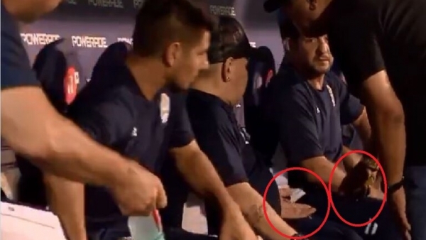 والمثير أن طاقم التدريب ارتبك وحاول أحد أفراده حجب الرؤية عما يفعله مارادونا، حيث وقف من مكانه وتظاهر بأنه يتابع المباراة عن كثب.
