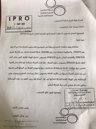 وبين افصاح الشركة عن مصالحة تمت بينها وبين امانة عمان الكبرى، تضمنت منع مطالبات الامانة واسقاط الادعاء المقدم منها، وتعويض الشركة عن المبالغ التي تكبدتها، وذلك بعد تحمل الشركة نصيبها من تكاليف الامانة بخصوص اعمال ودراسات المشروع.