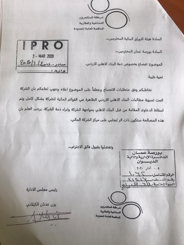 وأظهر افصاح أخر للشركة، عن وجود تسوية لمطالبات مالية مع البنك الأهلي الأردني، كما تسوية امانة عمان، حيث تم اسقاط الدعاوى المقامة من قبل البنك الأهلي بمواجهة الشركة وإبراء ذمتها، لافتين في افصاحهما بأن هذه المصالحات ستحمل أثراً ايجابياً على مركز الشركة المالي.