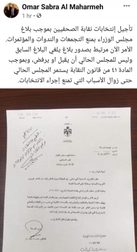 وقال محارمة في منشور له عبر فيسبوك "تأجيل إنتخابات نقابة الصحفيين بموجب بلاغ مجلس الوزراء بمنع التجمعات والندوات والمؤتمرات".