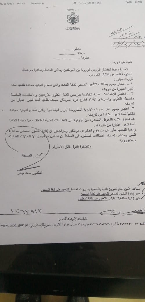 كما بين القرار اعتبار الاعفاءات الطبية الخاصة بمرضى الفشل الكلوي للاردنيين والاعفاءات الخاصة بالغسيل الكلوي ولاسرطان لابناء قطاع غزة السرطان مجدد تلقائيا لمدة شهر.