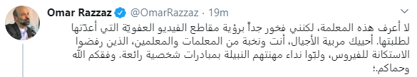 وقال الرزاز في تغريدة له عبر "تويتر" : لا أعرف هذه المعلمة، لكنني فخور جداً برؤية مقاطع الفيديو العفويّة التي أعدّتها لطلبتها. أحييك مربية الأجيال، أنت ونخبة من المعلمات والمعلمين، الذين رفضوا الاستكانة للفيروس، ولبّوا نداء مهنتهم النبيلة بمبادرات شخصية رائعة. وفقكم ﷲ وحماكم.؛