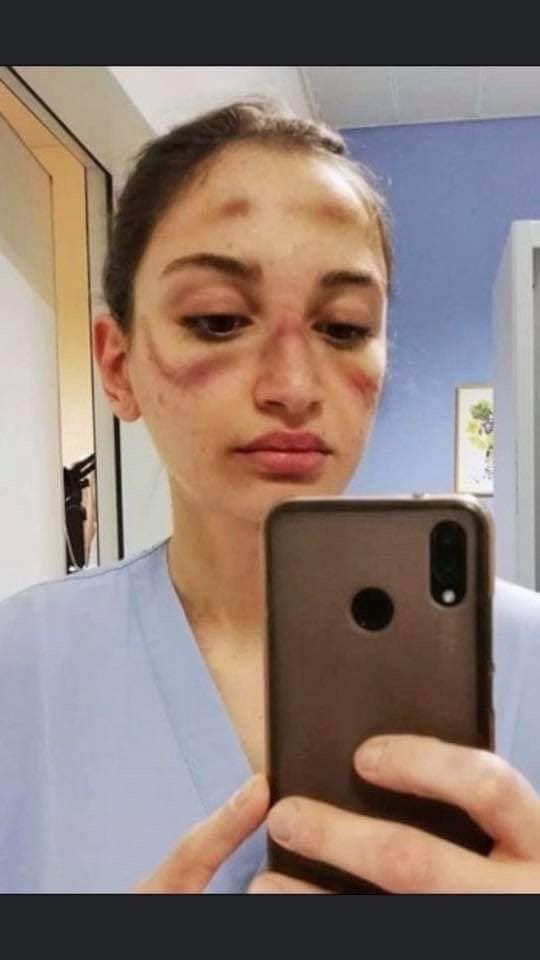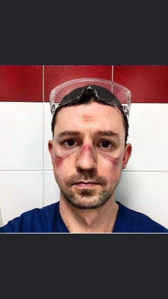 هذا ما يفعله ارتداء الملابس الواقية في وجوه الممرضين الإيطاليين. التعب ، القلق ، الخوف و علامات ارتداء القناع تبدو اشبه بالجروح ..