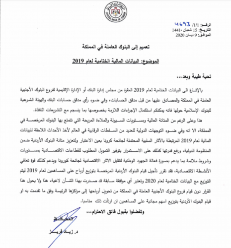 وبحسب كتاب صادر عن المركزي، قرر البنك اعتبار أي موافقة مسبقة بهذا الخصوص لاغية، موضحا أن القرار لا يحول دون قيام البنوك الأجنبية العاملة في المملكة من تحويل أرباحها إلى مراكزها الرئيسية، وفق ما تقدمت به، أو قيام البنوك الأردنية بتوزيع أسهم مجانية على المساهمين إن أرتأت ذلك مناسبا.