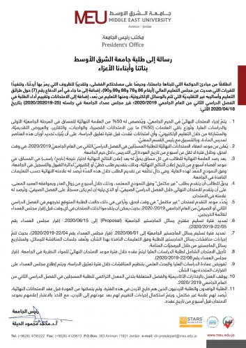عمان - قرر مجلس عمداء جامعة الشرق الأوسط، برئاسة رئيس الجامعة، الأستاذ الدكتور محمد الحيلة، إجراء الامتحانات النهائية للفصل الدراسي الثاني 2019/2020 للطلبة في الحرم الجامعي، ويخصص له 50% من العلامة النهائية للمساق في المرحلة الجامعية الأولى والدراسات العليا.