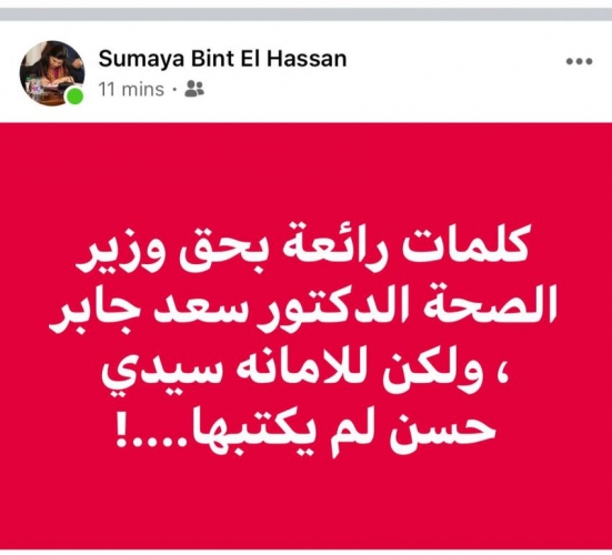 وقالت سموها عبر منشور مغلق لها على الفيسبوك وموجه للأصدقاء فقط" كلمات رائعة بحق وزير الصحة الدكتور سعد جابر ولكن للأمانة سيدي حسن لم ينشرها".
