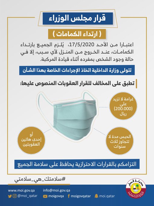 وقالت الوزارة، في بيان أصدرته مساء اليوم الخميس، إنه "اعتبارا من يوم الأحد... يلزم الجميع بارتداء الكمامات، عند الخروج من المنزل لأي سبب، إلا في حالة تواجد الشخص بمفرده أثناء قيادة المركبة"، وأضافت أنها "ستتولى اتخاذ الإجراءات اللازمة في هذا الصدد".