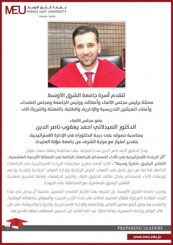 عمان – تتقدم أسرة جامعة الشرق الأوسط، ممثلة برئيس مجلس الأمناء وأعضائه، ورئيس الجامعة ومجلس العمداء، وأعضاء الهيئتين التدريسية والإدارية، والطلبة، بالتهنئة والتبريك الى عضو مجلس الأمناء الدكتور الصيدلاني احمد يعقوب ناصر الدين، بمناسبة حصوله على درجة الدكتوراه في الإدارة الاستراتيجية، بتقدير امتياز مع مرتبة الشرف، من جامعة مؤتة العتيدة.