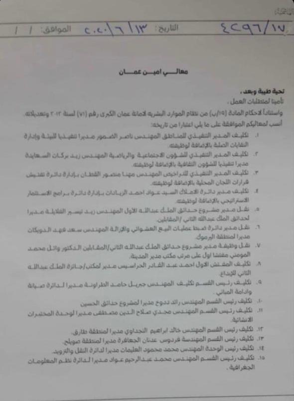 تكليفات لمدراء مناطق ومديريات في أمانة عمان (أسماء)